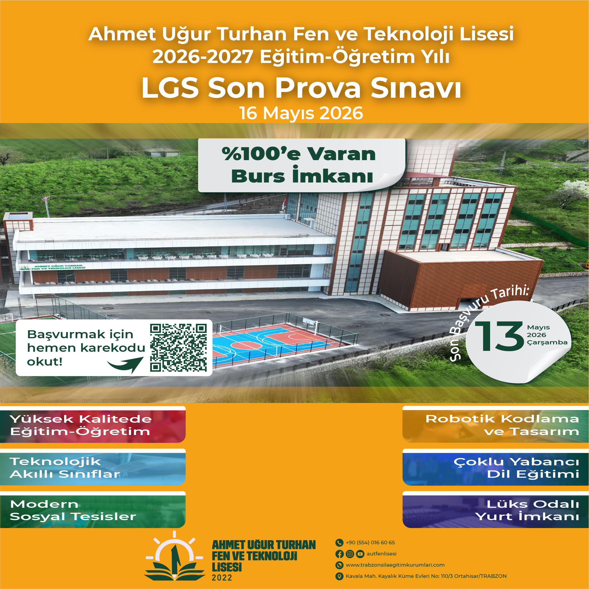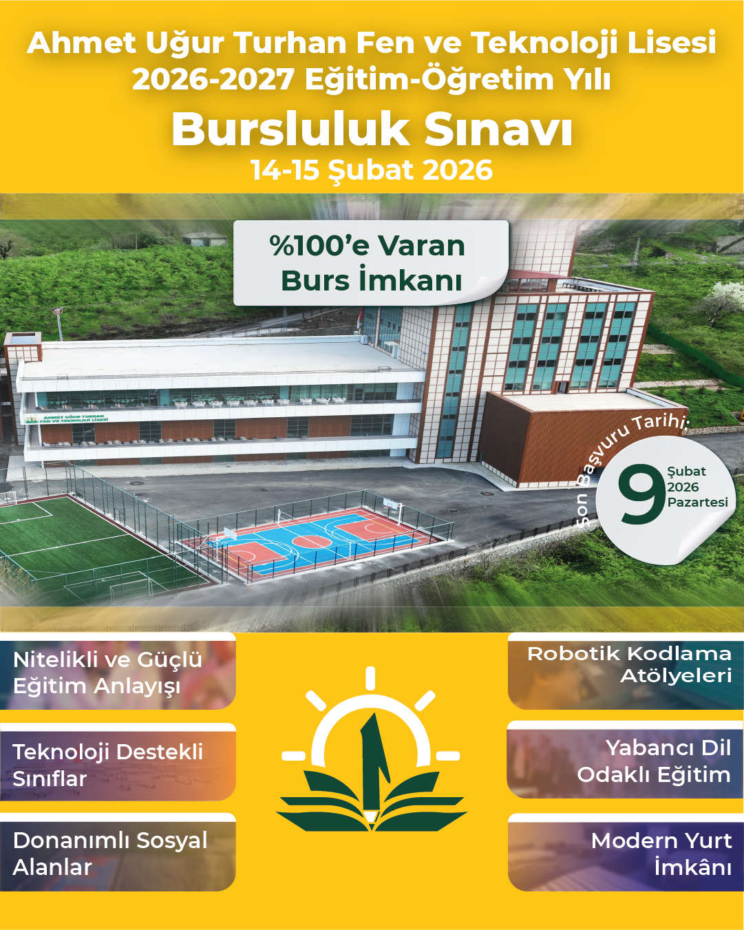 Ahmet Uğur Turhan Fen ve Teknoloji Lisesi’nde, sadece akademik başarı değil, tüm öğrencilerin manevi gelişiminede önem veriyoruz. Doğal güzelliklerle çevrili kampüsümüz, öğrencilerin hem sınıflarda aldıkları derslerle hem de dışarıdaki huzurlu ortamla ilham alacakları bir atmosfer sunmaktadır.